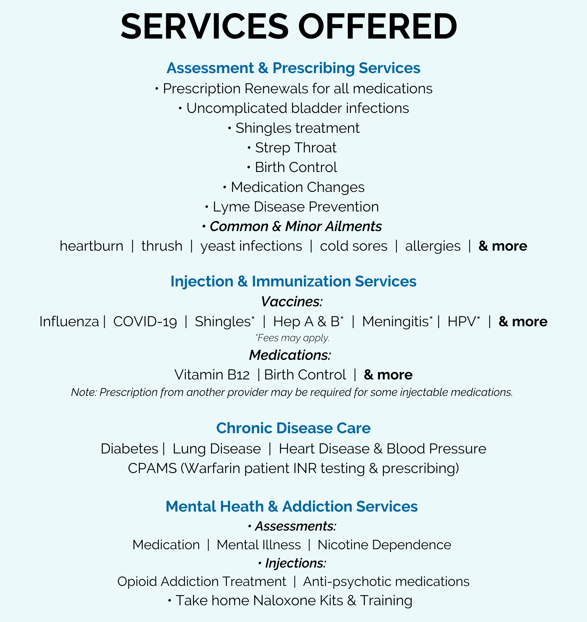 These pharmacist-led clinics will provide an extended suite of pharmacy primary care services at no charge to people with a valid Nova Scotia Health Card. These services include assessment and prescribing for Strep Throat, Pink Eye, UTIs, Chronic Disease Management (Diabetes, Asthma, COPD), prescription renewals for all medications and more. Publicly funded vaccines for adults and children are also available at these clinics as well as medical injections (fee may apply).